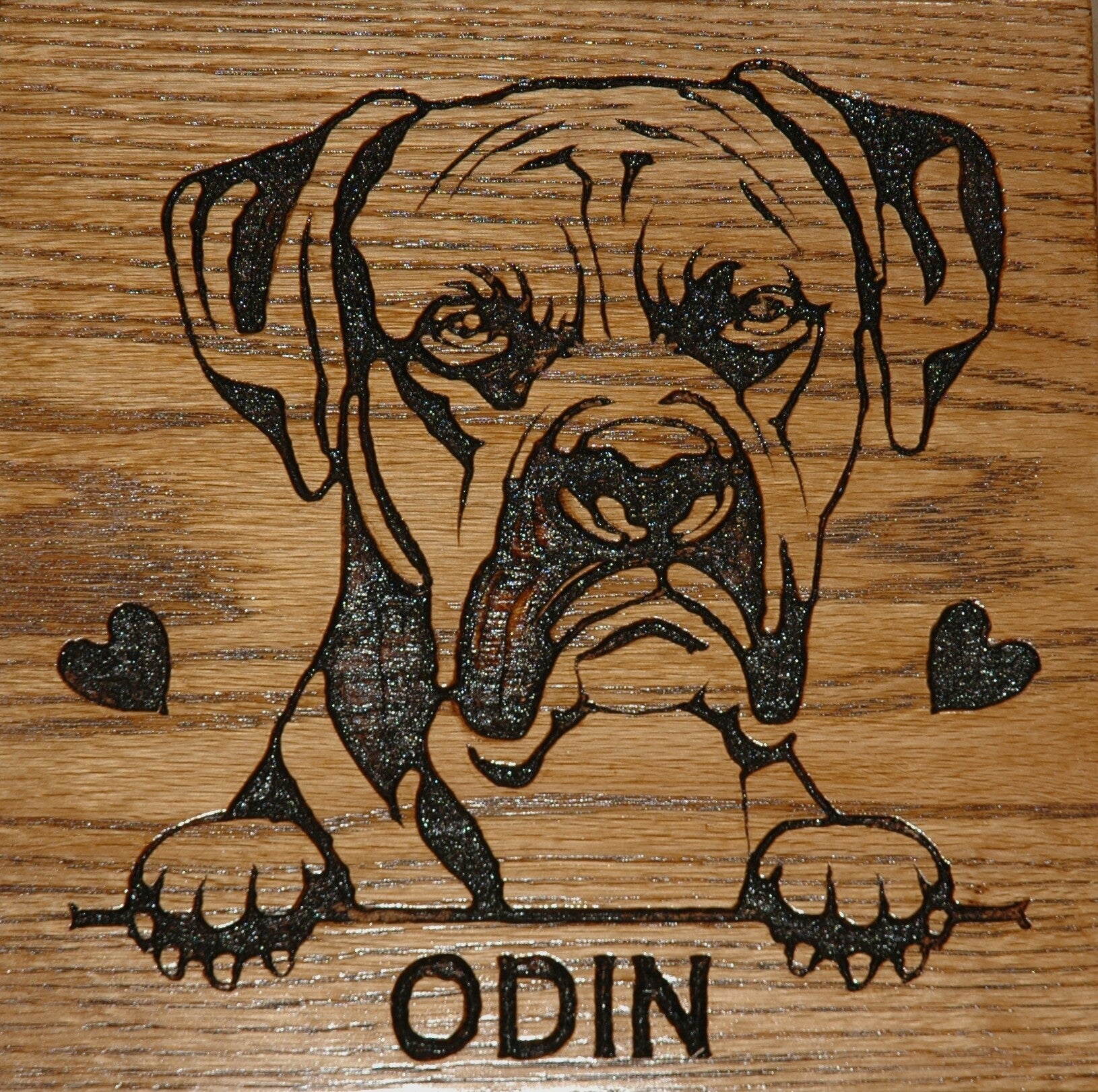 Approximately 9" x 9" hardwood plaque with YOUR PET'S NAME (INSTEAD OF BREED NAME) , includes hanger on back.