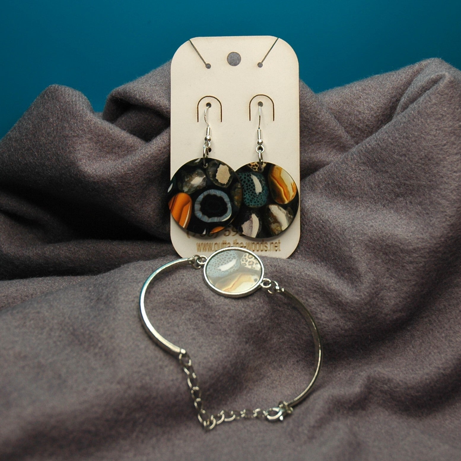 This is a set with a pair of earrings and a bracelet. The earrings are approx. 1" diameter the the setting on the bracelet is approx 1/2 ". These designs are printed then heat pressed onto the blanks.