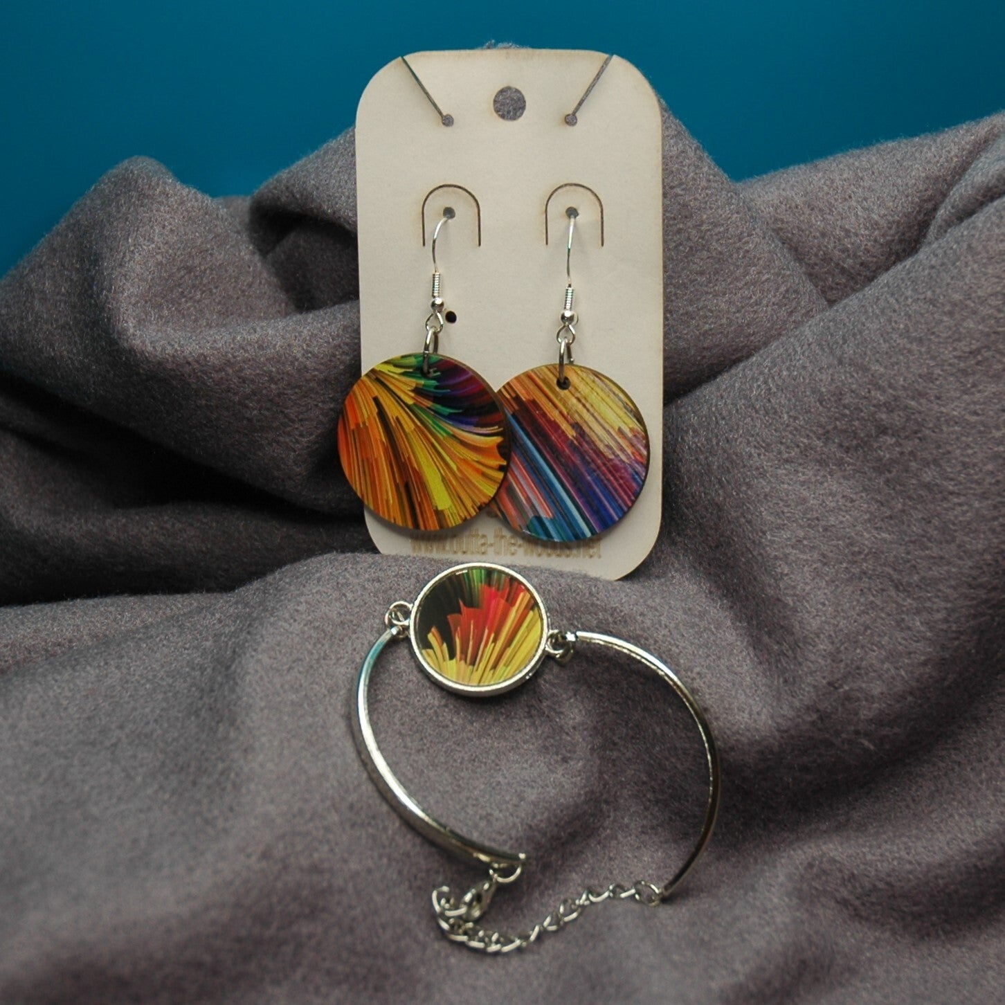This is a set with a pair of earrings and a bracelet. The earrings are approx. 1" diameter the the setting on the bracelet is approx 1/2 ". These designs are printed then heat pressed onto the blanks.